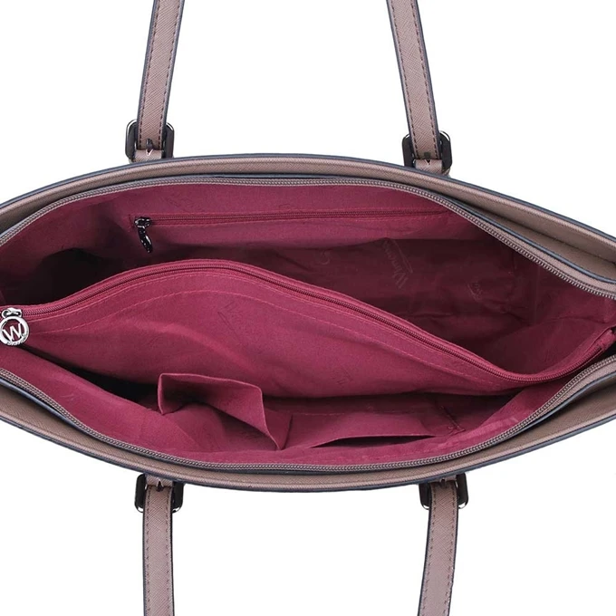 De Kyara Schoudertas van Wimona is een stijlvolle tas voor dames. De tas is zeer ruim ingedeeld en bevat ruimte voor A4-formaat documenten. Daarnaast is het interieur voorzien van een organisatiepaneel voor een smartphone en andere items. Deze Wimona tas is voorzien van een verdeler met ritssluiting. Hierin kunnen alle belangrijke eigendommen goed worden opgeborgen. De schoudertas bevat naast ruime handvatten ook een afneembare schouderriem, waardoor de tas ook over de schouder te dragen is. Deze stijlvolle tas kan volledig worden afgesloten door middel van een ritssluiting.